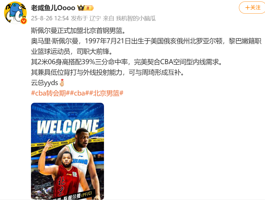 雷速体育8月26日讯 根据媒体人@老咸鱼儿Oooo报道:斯佩尔曼正式加盟北京北汽男篮。原文如下:奥马里·斯佩尔曼,1997年7月21日出生于美国俄亥俄州北罗亚尔顿,黎巴嫩籍职业篮球运动员,司职大前锋。其2米06身高搭配39%三分命中率,完美契合CBA空间型内线需求。其兼具低位背打与外线投射能力,可与周琦形成互补。 此外根据媒体人@亿男川陵报道:2018年的...